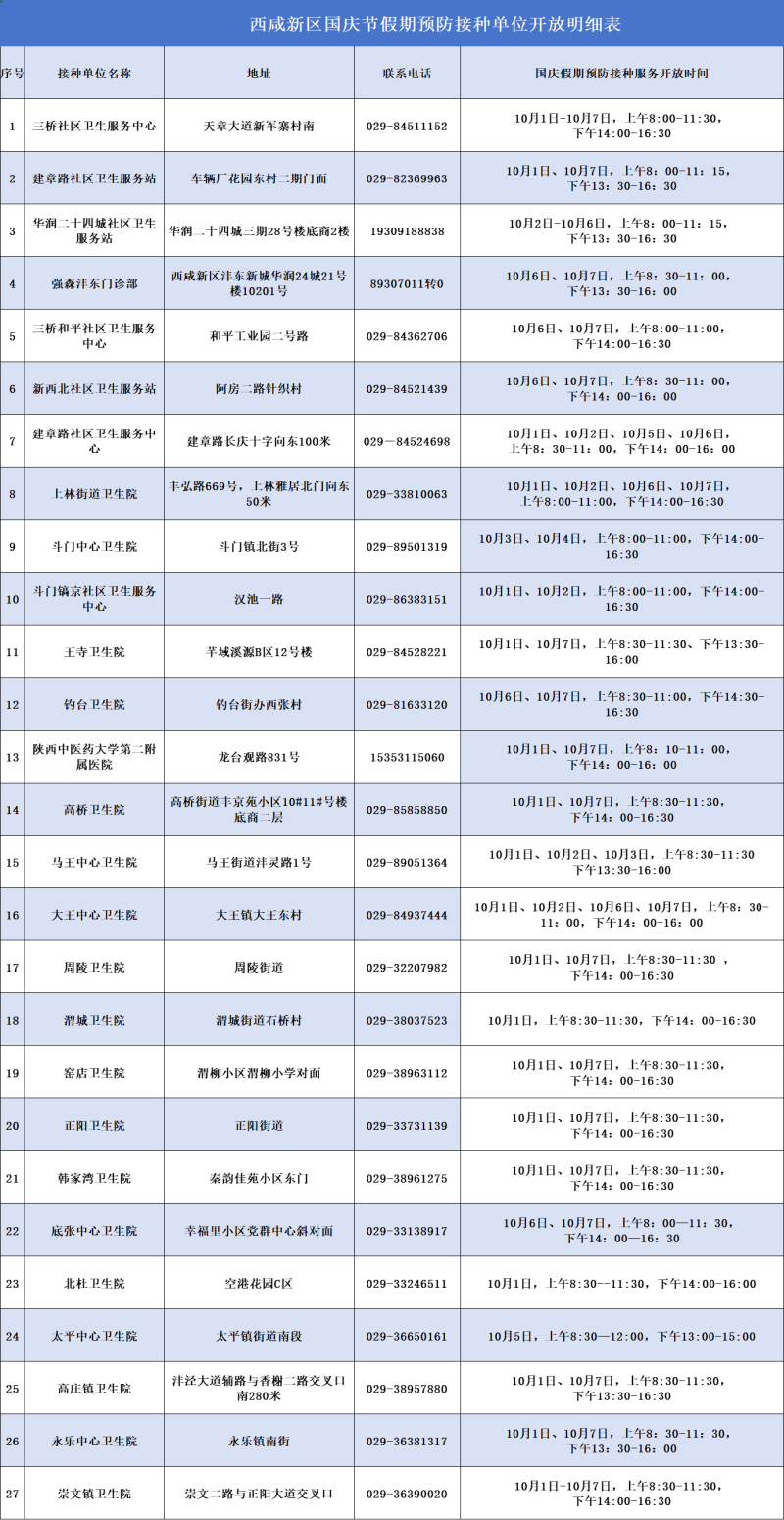 为全面守护辖区群众健康安全,国庆节假日期间,新区开展“健康西咸进社区”活动,将服务送到群众家门口,同时,疫苗接种工作“不打烊”,最全健康服务信息快来收藏。
