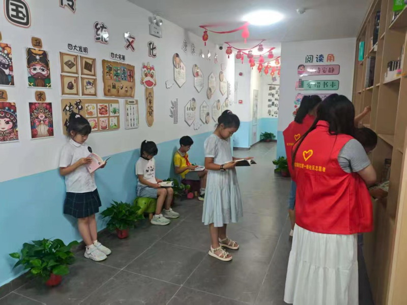 走进童乐铺,最亮眼的便是那片阅读角。书架上,童话寓言、科普百科、经典名著、趣味绘本整齐排列,像一个个等待开启的知识盲盒。志愿者或陪孩子找书,或轻声交流阅读心得,暖心的互动让书香愈发沁人。孩子们或席地而坐,或靠墙静读,稚嫩的脸庞上时而因童话情节绽放欢笑,时而因科普新知沉思,在这片小小的天地里,阅读的种子正悄然在心田生根发芽。