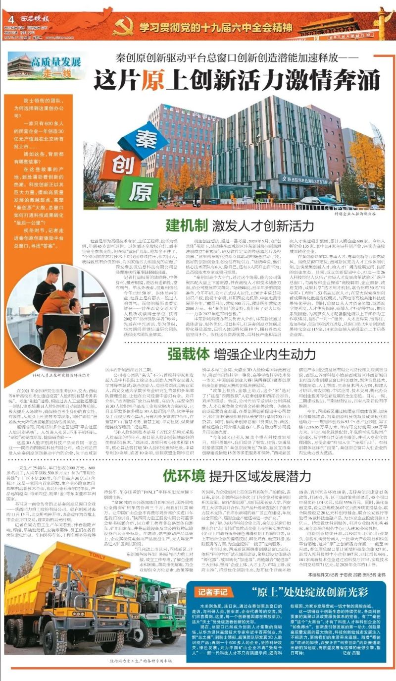 今天,西安日报、西安晚报整版报道《这片“原”上创新活力激情奔涌》聚焦西咸新区围绕秦创原总窗口定位,完善人才工作体制机制,加快科创载体建设,持续优化创新生态,在“科技创新”的新赛道跑出新的加速度。