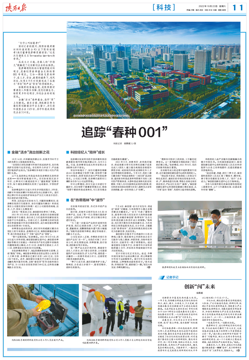 张彦峰领衔的纳米智能吸能材料项目,是秦创原春种基金支持的第001号项目。它如一颗春光里的种子,在人才、资金、政策的滋养下,迎风而长,仅用4个月时间就完成了从技术“书架”到产品“货架”的华丽转身。