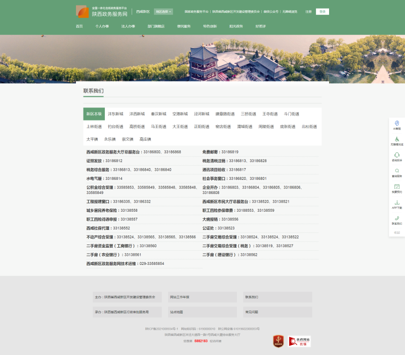电脑端:访问西咸新区政务服务网(https://zw.xixianxinqu.gov.cn),点击右侧“联系我们”,即可查询新区、新城、街镇各类业务咨询电话。