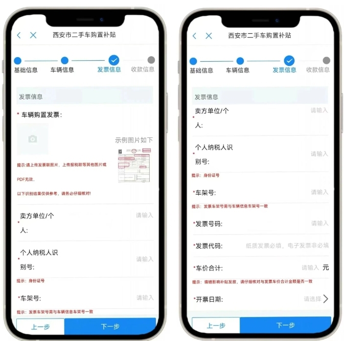 请核对您的个人信息,并确保所选购车企业与发票信息一致。确认所有信息准确无误后,点击【下一步】继续。