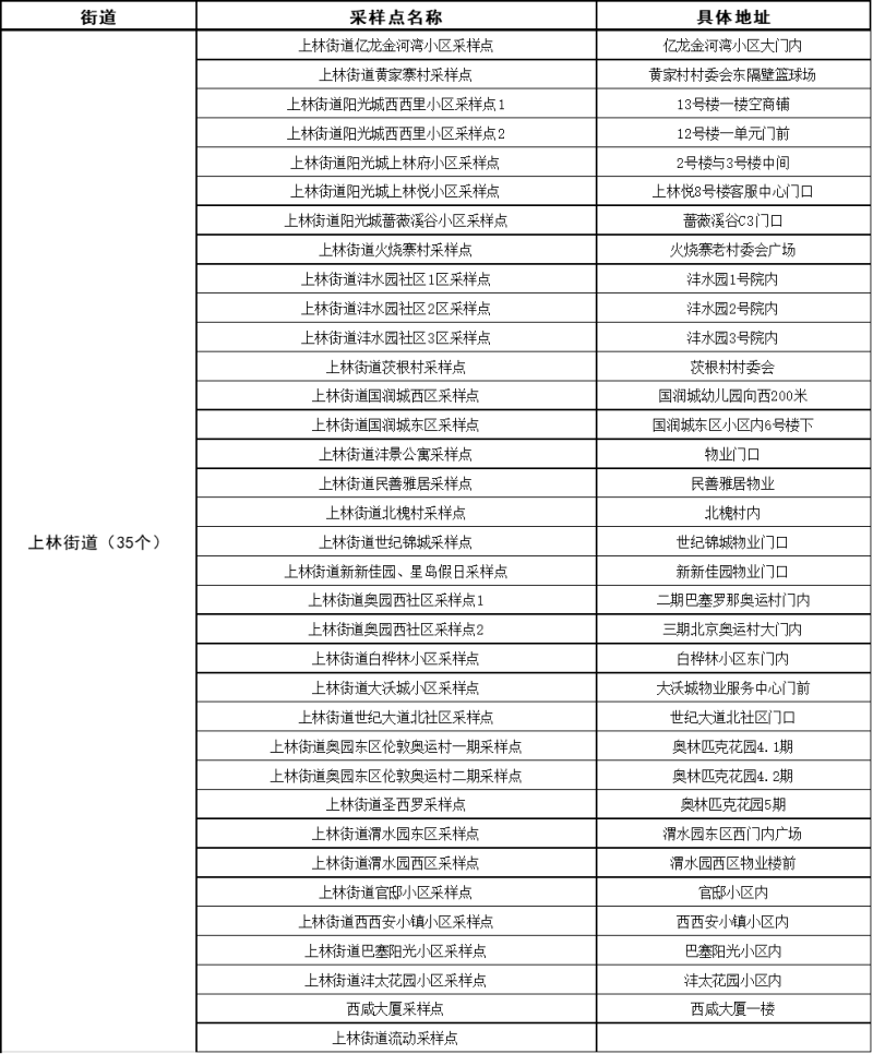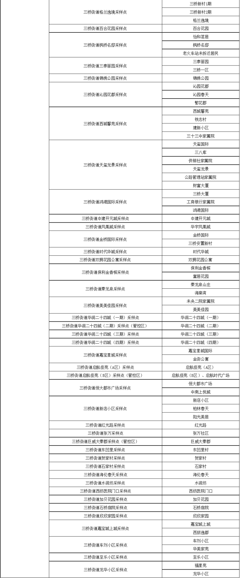 核酸检测采样点及具体时间安排以各街道办事处、社区(村)、单位通知为准,根据检测需求可能进行调整,请居民群众留意街道、社区(村)通知,或拨打新区咨询服务电话了解最新采样点信息。具体地点详见后附表格。