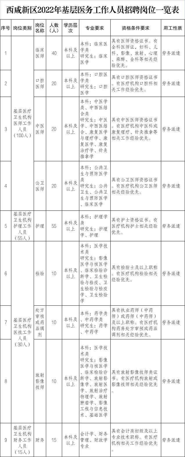 计划公开招聘派遣制基层医务工作人员200名,其中医师工作人员100人、护理工作人员55人、医技工作人员30人、财务工作人员15人。工作地点为西咸新区各乡镇卫生院(社区卫生服务中心),具体单位按照录取成绩分配。具体岗位和数量详见《西咸新区2022年基层医务工作人员招聘岗位一览表》(见文末)。毕业证、学位证以及招聘岗位所要求的各类证书须于2022年7月31日前取得。