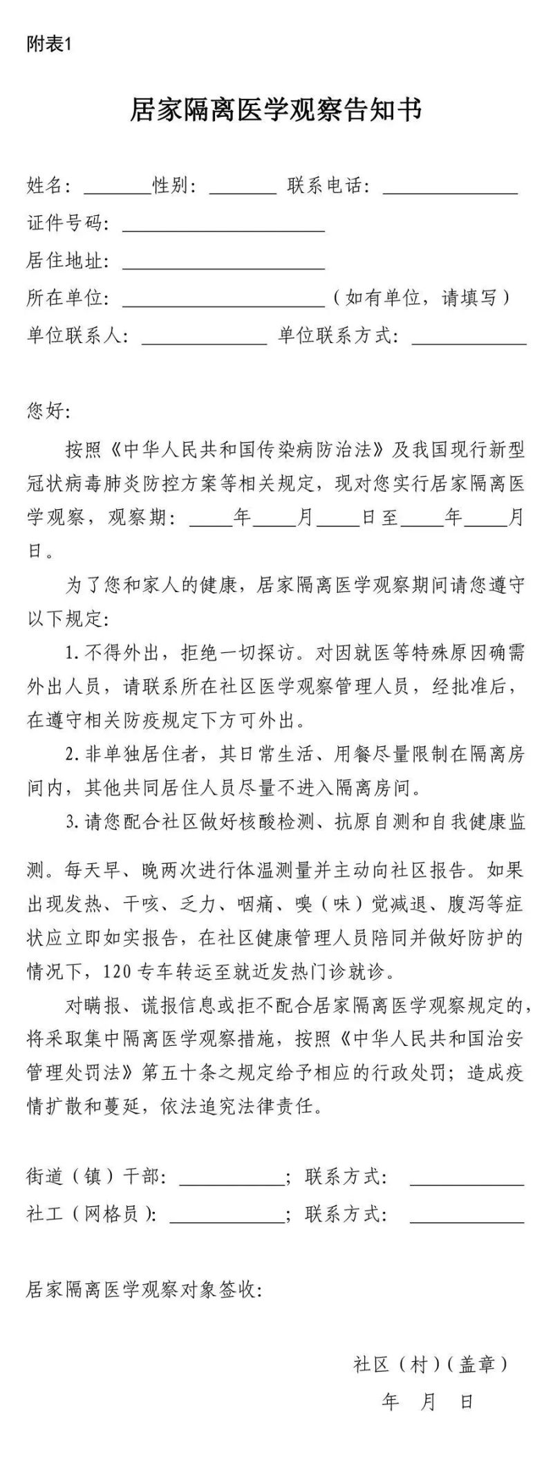 1.登记造册。街道(镇)、社区(村)工作人员要及时与居家隔离医学观察人员取得联系,掌握居家隔离医学观察人员信息,查看居住场所是否满足居家隔离医学观察条件,下发居家隔离医学观察告知书(参见附表1),告知居家隔离医学观察相关要求,并按照“一户一档”或“一人一档”要求,登记造册,纳入社区网格化管理。掌握空巢独居老年人、有基础性疾病患者、孕产妇、血液透析患者等居家隔离医学观察特殊人员情况,建立台账,做好必要的生活保障和关爱服务。