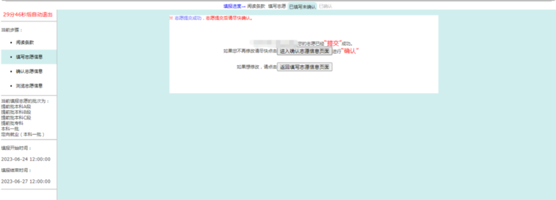 全部志愿信息输入完毕后,必须点击“提交”按钮,否则服务器无法接收到志愿信息。全部志愿确定无误后,必须点击“确认”按钮。在点击“确认”按钮之前,可以任意修改所填志愿。