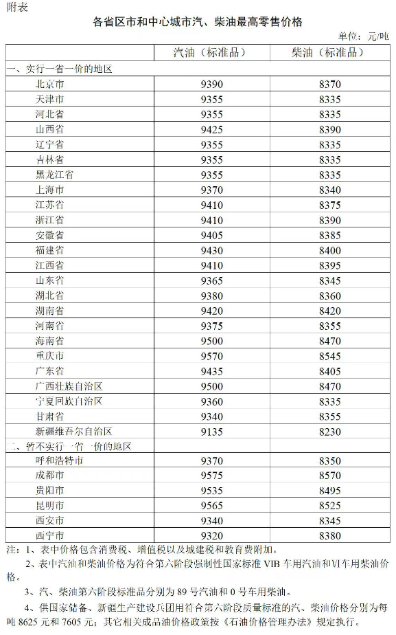 附:各省区市和中心城市汽、柴油最高零售价格