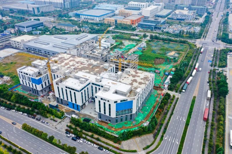正在建设的项目一期,建筑面积约20.6万平方米,共有8栋建筑单体,主要建设科研办公楼、工业研发楼及配套设施。目前,项目8栋建筑主体均已封顶,正在进行内部二次结构及各项专业交叉施工。预计2025年全面建成运营,建成投产后预计年产值超过百亿元。