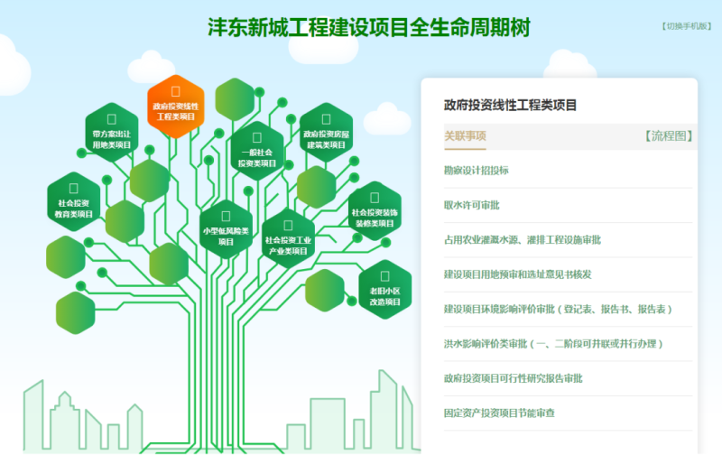 此外,从企业需求出发,按照工程建设项目类别分级分类编制9类工改项目审批流程图,形成“一树九果”工程建设项目全生命周期树,对照每类工程建设项目关联性信息,为建设单位提供“靶向推送、智能办理、即查即清”的全新服务。