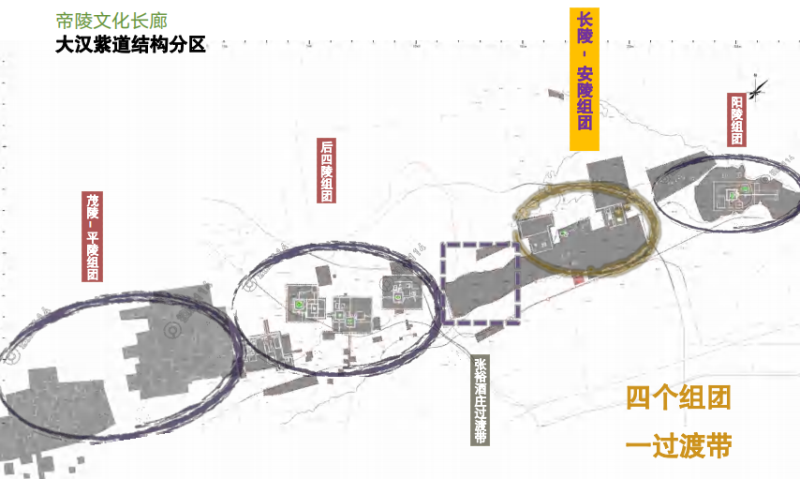 秦汉新城“大汉紫道”帝陵文化长廊项目,分为后四陵组团、张裕城堡过渡带、长陵-安陵组团、阳陵组团4个板块,将按照历史发展脉络,严格遵守文物和永久基本农田保护要求,以环境整治和景观提升为主,通过分级实施道路提升改造,设置综合性服务驿站和露营房车营地等方式,打造沉浸式品味历史文化、体验式感受自然之美、交互式带动活力村庄的多元特色廊道,展现“山-水-原-城-陵”格局和大遗址景观之美。