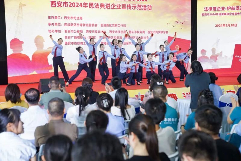 活动现场,西安市司法局党组成员、副局长雷景茹向西咸新区企业代表赠送民法典等法律书籍,西安经开区税务局、西安市法治文艺宣传队、西安市律师协会等单位联合奉献了一场形式多样、内容丰富的文艺汇演。演出通过快板、朗诵、情景剧等载体展现,将各条法治战线上的真实案例融入其中,精彩生动、寓“法”于乐,赢得观众阵阵掌声。