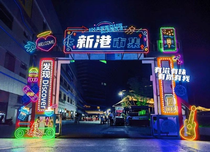 新港市集位于创新港学镇中心二期,紧邻地铁五号线创新港东站,交通优势明显,是集特色小吃、烧烤、海鲜、甜点及社团演出为一体的综合性文旅餐饮街区。