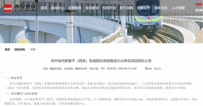 近日,西安市轨道交通集团有限公司发布《关中城市群富平(阎良)至咸阳机场铁路勘察、设计项目招标计划》,透露该铁路项目已获得国家发展和改革委员会批准,具备招标条件。随后,该线路的设计咨询、设计总承包及8个标段勘察项目开始正式招标。