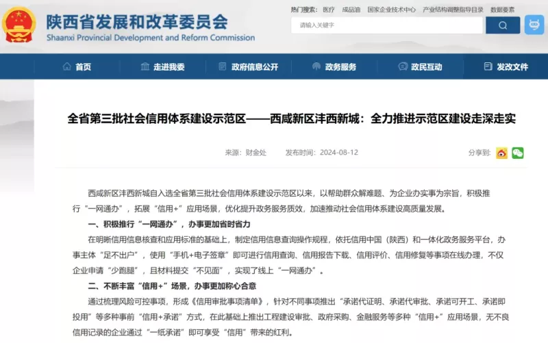 近日,陕西省发展和改革委员会官网发布稿件《全省第三批社会信用体系建设示范区——西咸新区沣西新城:全力推进示范区建设走深走实》,关注沣西新城积极推行“一网通办”,拓展“信用+”应用场景,优化提升政务服务质效,加速推动社会信用体系建设高质量发展。