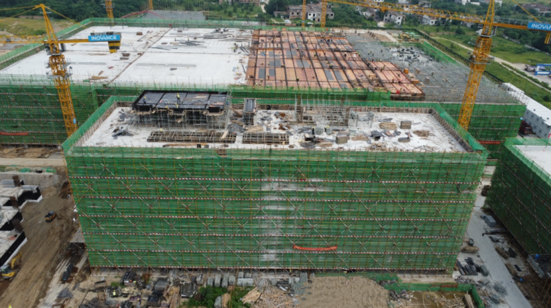 项目自今年3月正式开工以来,截至目前4号楼、5号楼已全面封顶,正在进行二次结构及安装施工;1号厂房地面混凝土浇筑已完成,正在开展夹层主体施工;2号厂房主体施工已完成80%;3号楼已完成基础混凝土及防水施工,正在开展承台基础部分的施工工作。
