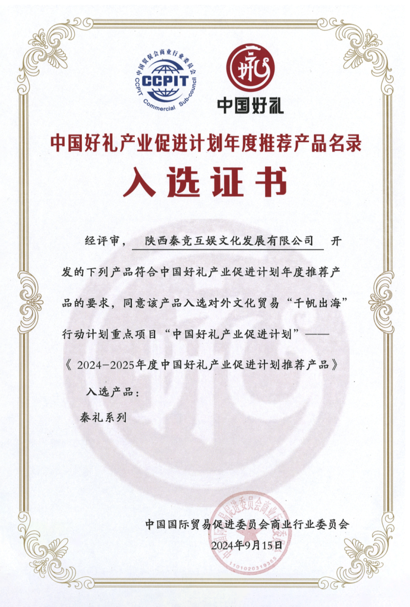 近日,《中国好礼产业促进计划2024~2025年度推荐产品》评审结果公布,泾河新城入区企业陕西秦竞互娱文化发展有限公司申报的秦礼系列产品成功入选。