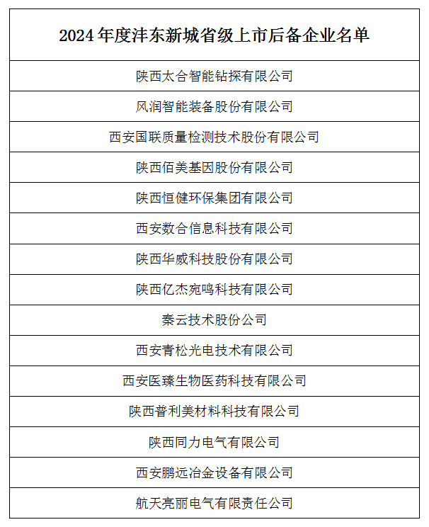 2024年度陕西省上市后备企业名单(沣东新城入选15家企业)