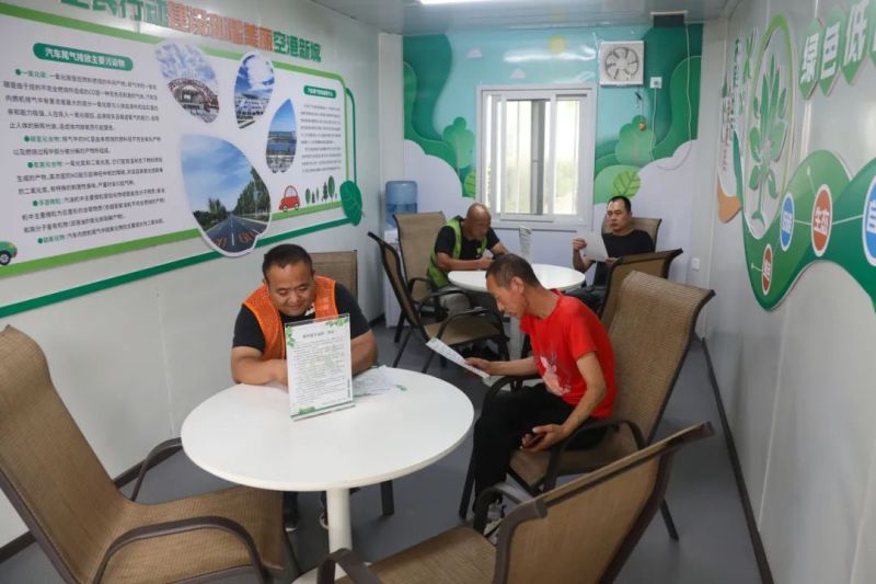 时间拨回2023年6月,当马师傅第一次走进位于华翰物流南门附近的“生态小憩驿站”时,惊喜不已:“真没想到!空调凉飕飕的,有热水喝,有干净椅子坐,还能买点东西。关键能安心熄火,下车透透气,这感觉,像有了个路上的‘家’!”这个由回收集装箱改造而成的小屋,内部明亮整洁,公共座椅、空调、饮水机、小卖部一应俱全,墙上还挂着醒目的环保宣传画,提醒着大家怠速的危害。正是这一排特别的“集装箱小屋”改变了这一切,它们不仅温暖了无数“马师傅们”的心,更悄然为蓝天白云贡献力量。这就是——空港新城生态小憩驿站。