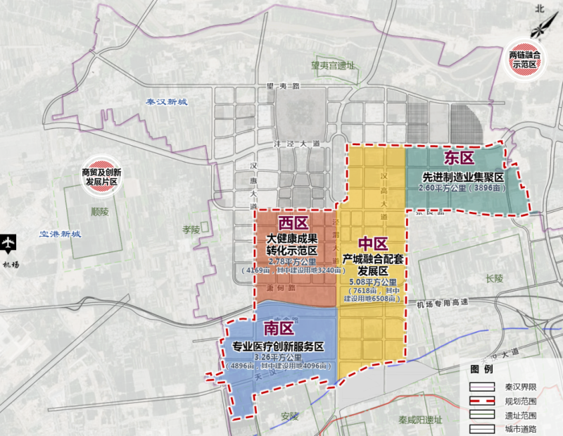根据最新印发的《‌秦汉新城大健康产业链发展实施方案(2025-2027)》,大健康先进制造产业片区将以“一园四区+拓展区”总体规划协同发展:围绕总规划面积13.72平方公里的西咸新区·秦汉大健康产业园,南区(专业医疗创新服务区)、西区(大健康成果转化示范区)、东区(先进制造业集聚区)、中区(产城融合配套发展区)和拓展区各骋所长、摆脱同质、协同推进,加快激活区域产业聚变效应。