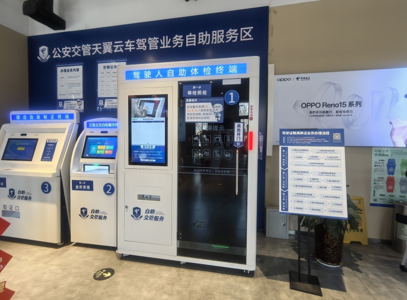 走进大厅,科技感扑面而来。这里并非传统的窗口服务模式,而是基于天翼云网资源底座,充分运用了云计算、人工智能等新一代信息技术。大厅内整齐排列着驾驶人自助体检终端、交管业务自助服务终端、综合自助制证终端等智能化设备,构建了一个功能完备的“微型车管所”。