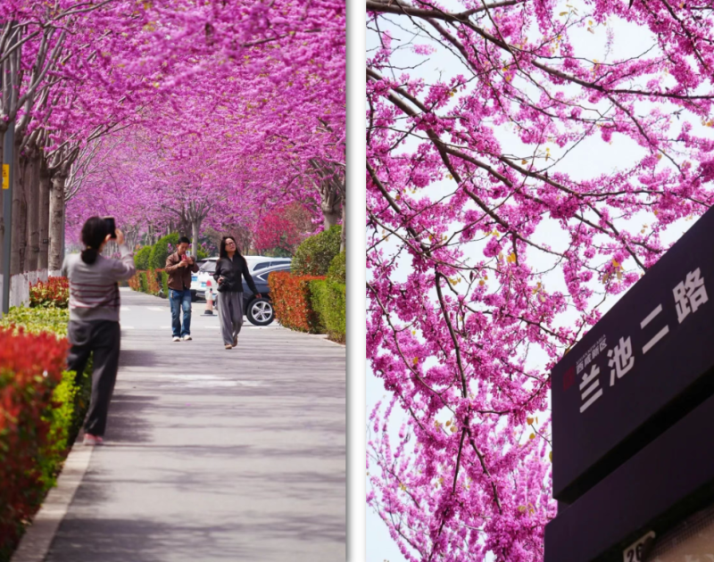 兰池二路的紫荆花带沿专属步行道延伸,全程无遮挡、视野开阔,是春日慢行的绝佳去处。沿着花廊慢慢走,沿途还能偶遇散步的市民、拍照的游客,或是穿行的学子,烟火气与浪漫感拉满,非常适合放空散心、轻徒步。