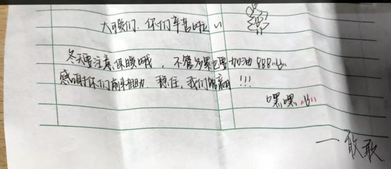 “大可爱们,你们辛苦了!冬天要注意保暖哦,不管多累也要加油,感谢你们前来相助.稳住,我们能赢!”连续几日的核酸采样,还有一件特别让贠景强感动的事,就是在上门到泾华学校为学生检测时,很多学生在看到医护人员的辛苦时纷纷把感谢之情写到字条上,至今想起此事,贠景强说:“看到学生们真诚和鼓励的留言,那一刻,受再多苦也觉着值得了。”