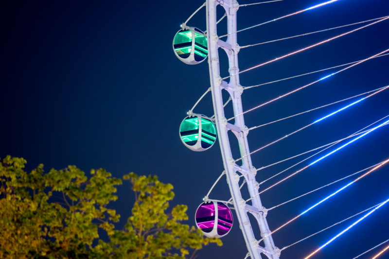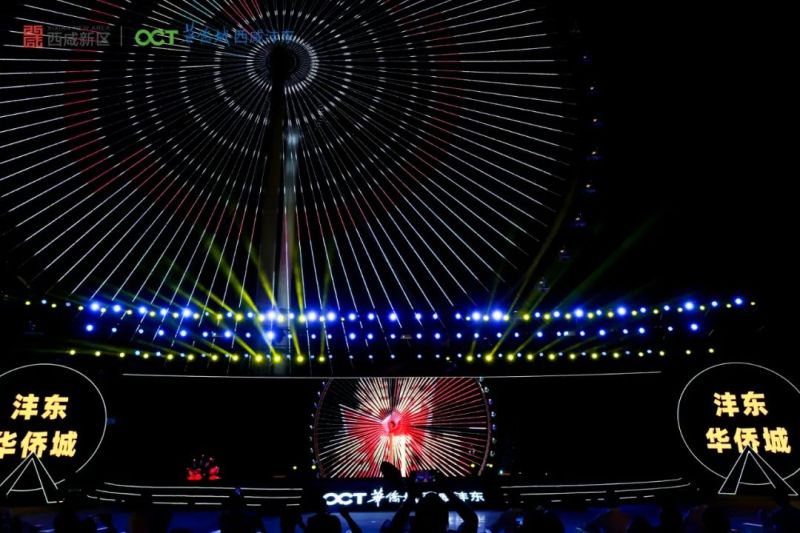 等到夜幕降临,灯光秀开启,摩天轮轿厢还有流光溢彩的灯光加持,梦幻感飙升,成为整个沣东华侨城文旅融合示范区的重要视觉焦点和大西安城市浪漫新地标。