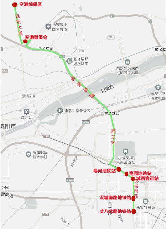 该定制公交于7月1日(本周五)正式开通运营,公交采用36座大型豪华客车,1人1座,每日早晨7:10从丈八北路地铁站出发,途经汉城南路地铁站、城西客运站、枣园地铁站、皂河地铁站、空港新城管委会,最终抵达空港综保区,下午17:20由空港综保区开往丈八北路地铁站。线路全长36公里,用时70分钟。