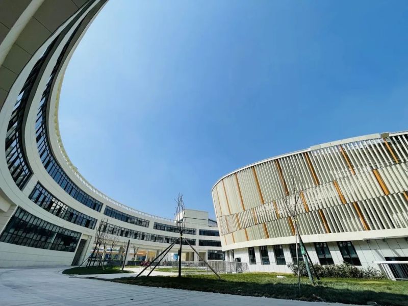 学校设计新颖,融合“节能、绿色、科技”理念,采用“一环+八枝+两翼”布局,各功能区之间既相对独立又互为整体。除此之外,设置高品质恒温游泳馆、标准体育场、智能地下接送系统以及创客实验室、机器人实验室、编程教室等特色功能教室70间。