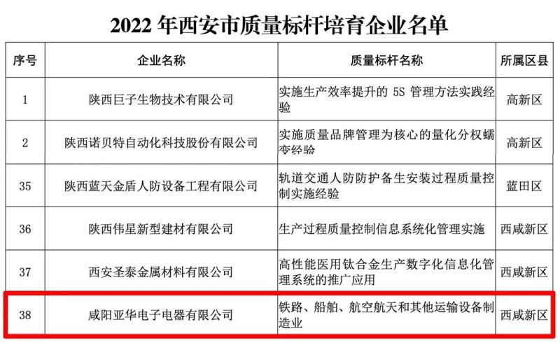 近日,西安市工业和信息化局公布2022年质量标杆培育企业名单,西咸新区秦汉新城亚华电子电器有限公司以“铁路、船舶、航空航天和其他运输设备制造业”登上榜单。