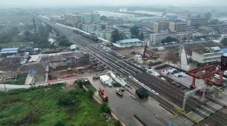 顶进作业于9月17日开始,历时15天,顺利穿过了4股铁路,精准到达设计位置,提前5天完成下穿任务。期间,为了不影响铁路客货列车正常通行,施工单位提前利用钢梁将4股铁路线架空稳定,采取了吃土顶进法进行施工,使用30组500吨液压千斤顶,将四孔连体框架桥安全平稳顶进了45.8米。