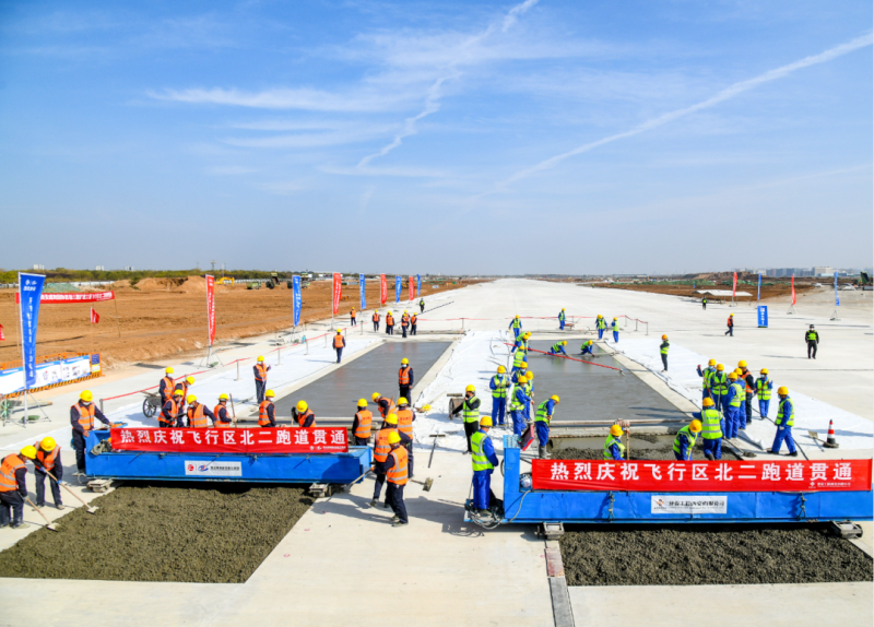 据悉,北二跑道于2021年3月开始土方与地基处理工程施工,面对疫情影响、持续高温、暴雨洪涝等重重困难叠加的复杂局面,全体建设者辛勤付出、大干快上,高峰时期每日投入作业人员1200余人、施工器械200余台,采用3D打印毫米级摊铺技术,确保了工程高效有序推进,如期完成任务。