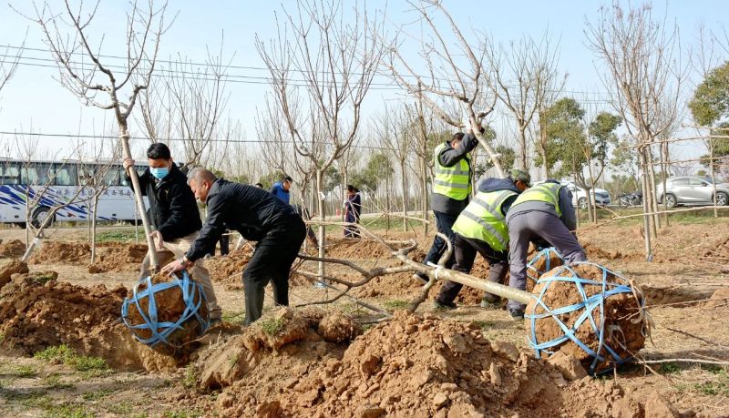 挥锹挖坑、植入树苗、培土填坑、压实浇水……3月的早晨,义陵陵区春意盎然,大家三人一队、五人成组,有序分工、默契配合,合力种下一棵棵苗木,现场一派热火朝天的劳动景象。经过一个多小时奋战,一排排樱花树整整齐齐在这里安了家。
