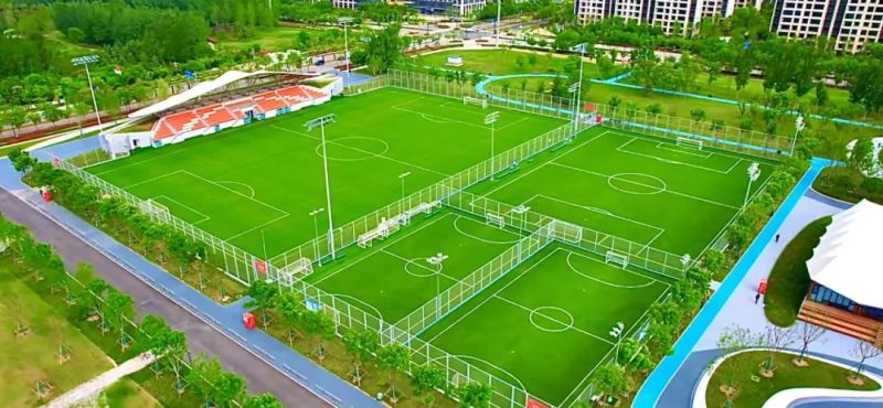 西安国际足球中心配套专业训练场一一沣东足球公园,用地约143亩,建设内容包含2块11人制专业天然锚固草足球训练场和1块8人制、2块5人制人造草足球训练场,同时配备了篮球、乒乓球、羽毛球等群众健身活动场地以及相关配套设施,是具备国际水准的专业竞技足球训练中心、青少年足球培训中心、区域社区全民健身及体育运动健康中心,能够满足国内标准赛事、国际标准训练及群众专业足球训练和大众体育活动的需求。