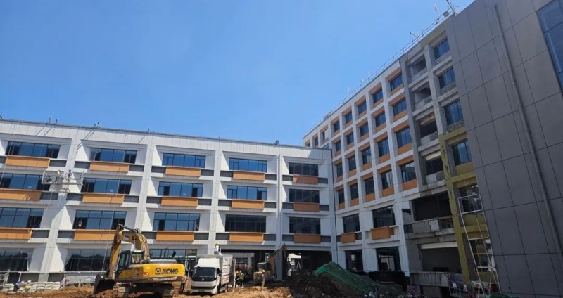 “室内工程方面,职工宿舍楼已完成精装修,其余楼栋正有条不紊推进安装收尾工作。”据屈龙飞介绍,目前学校食堂除正在安装铝扣板、增添餐厅设备及餐桌餐椅外,还同步进行外立面喷涂工作;教学综合楼走廊和报告厅顶板施工已接近尾声,可上人屋面与楼梯部分则进行最后的贴砖作业。“室内整体装修工作进展顺利,预计将于7月底和室外工程同时完工。”他说。