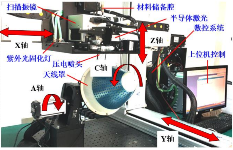 在自主创新“复杂曲面共形频选天线罩一体化喷射成型技术”的基础上,研发团队还利用该技术研制了电磁隐身天线罩一体化喷射成形设备和相应的电磁隐身天线罩样件。