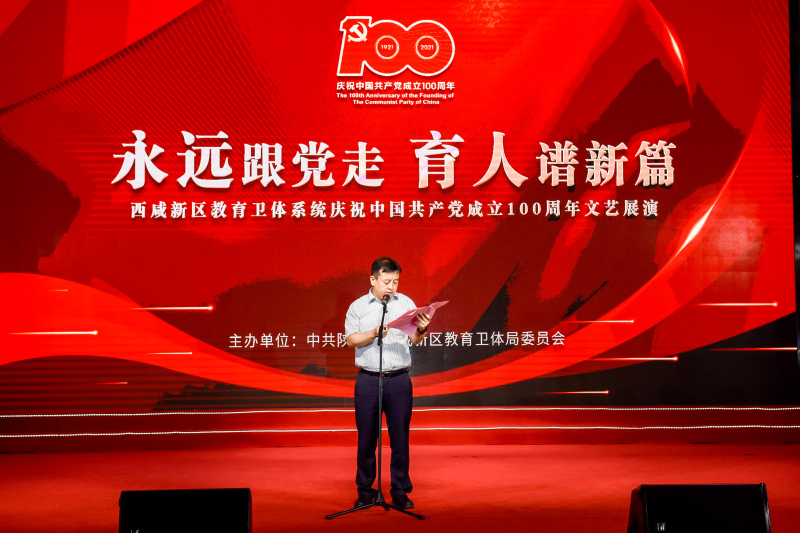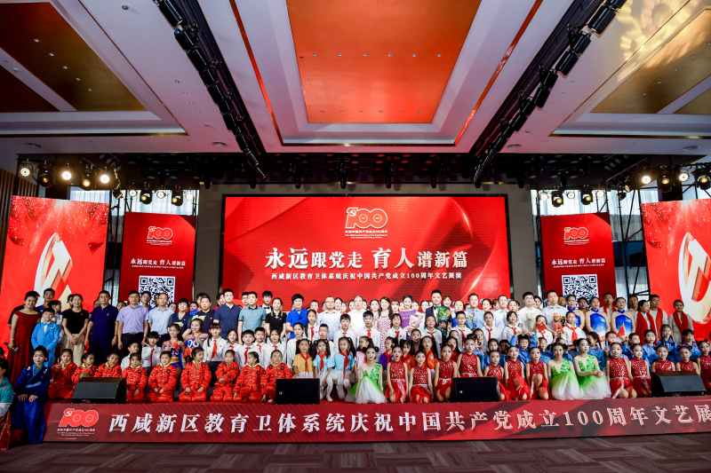 永远跟党走、育人谱新篇。6月30日,由中共陕西省西咸新区教育卫体局委员会主办,沣东新城教育卫体局承办,空港、秦汉、沣西、泾河新城教育卫体局和西咸集团协办的“永远跟党走、育人谱新篇”西咸新区教育卫体系统庆祝中国共产党成立100周年文艺展演活动在西咸会议中心举办。西咸新区党工委委员、管委会总规划师陈默出席活动并致辞;陕西省人民医院工会副主席董梅,西咸新区机关党委专职副书记王斌,西咸新区党史学习教育领导小组办公室副主任董知行,西咸新区教育卫体局党委书记、局长张海明;新区教育卫体局全体领导和干部员工;各新城教育卫体局班子成员、业务负责同志;各新城中小学校长、乡镇卫生院院长(社区卫生服务中心主任)等300余人观看了演出。