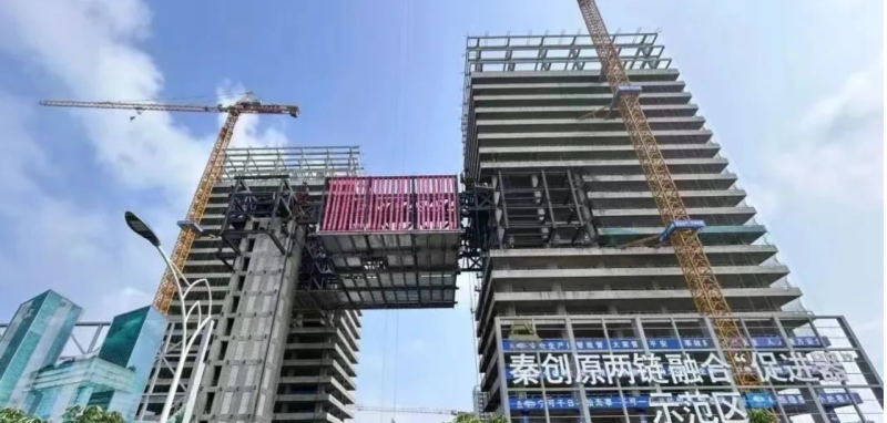 截至目前,重达1818吨的钢结构空中连廊顺利完成提升作业,两座大楼在59.85米高处成功实现高空交汇,项目建设取得重要阶段性成果。