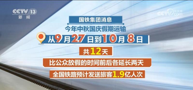 来自国铁集团的消息显示,今年中秋国庆假期运输从9月27日启动,到10月8日,共12天,比公众放假的时间前后各延长了两天,这期间全国铁路预计发送旅客1.9亿人次。