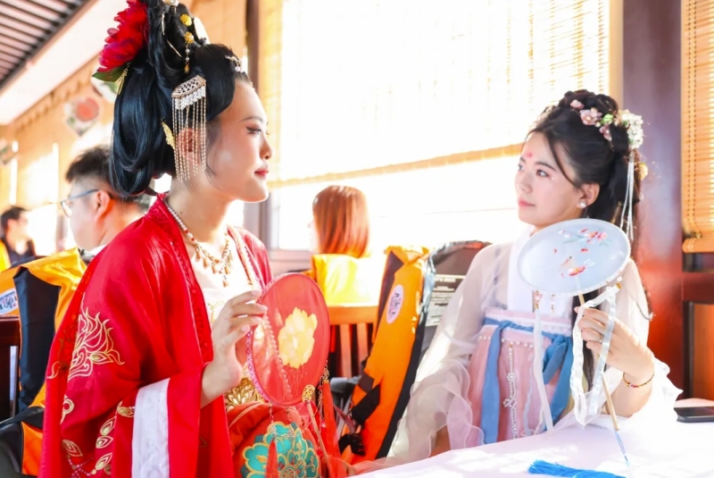 古香古色的画舫里,携手家人泛舟湖上,一边欣赏美景,一边亲手制作月饼其乐融融。在池望还有剪纸、手工针织等手作体验。