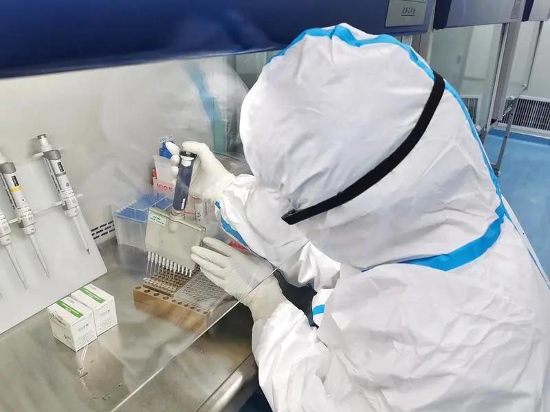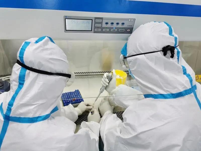 核酸检测员在生物安全柜内进行样本操作。采用混采合检测的方法,风东实验室日检测能力最高可达50万人份 。