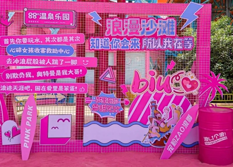 芭比粉的细沙柔软细腻,搭配粉色花墙、彩色遮阳伞和可爱泳圈,整个区域像掉进童话书里的“粉色王国”。穿浅色泳衣站在其中,随手拍都是惊艳朋友圈的大片,轻松拥有“专属粉色海景”。