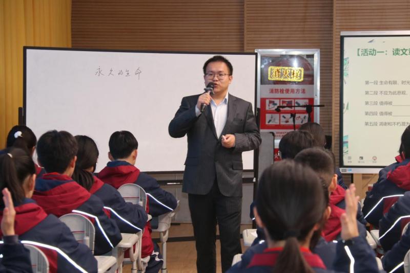 在课堂展示环节,说课教师分别进行八年级上册单元整体教学说课,授课教师分别展示《背影》和《永久的生命》现场教学。