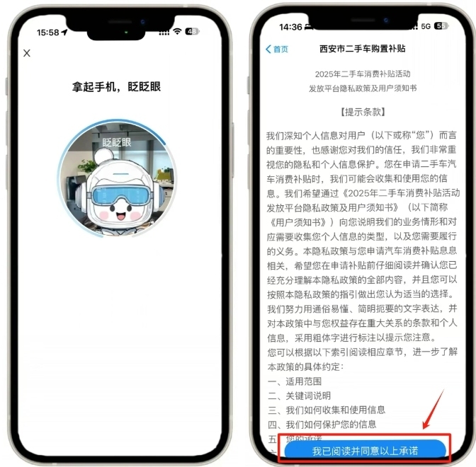 在【首页】点击轮播图【二手车购置补贴】或下方图标,点击【同意并授权】进入活动页面。